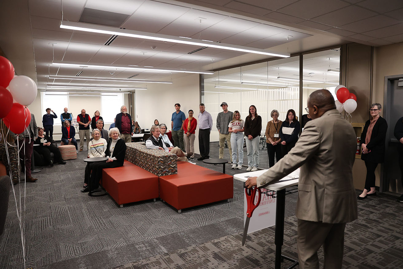 The space was dedicated to Pat and Connie Sidley (Class of 72’), who spoke about their support of this project and their involvement with Miami Libraries. Pat said “The libraries are one space that can influence students across divisions in the University.” The Sidleys, longtime library supporters, mentioned how important it was for their patronage to have the widest impact on the student body, and therefore was why they had found a home with the University Libraries.